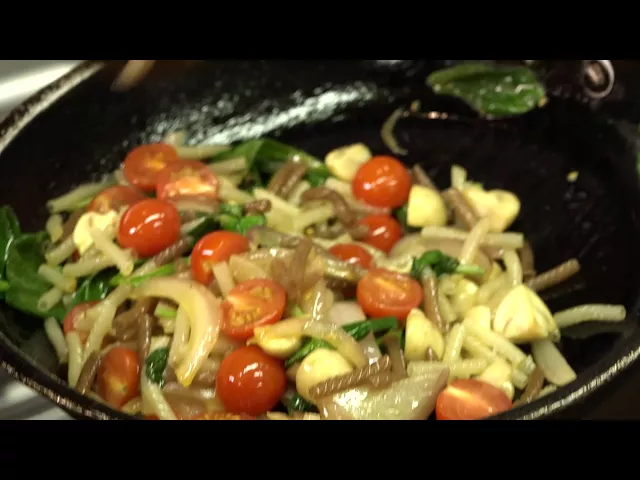 through, but we don't want it swimming in sauce. There you have it, non-dairy Alfredo with mushrooms, spinach, and spring tomatoes, and